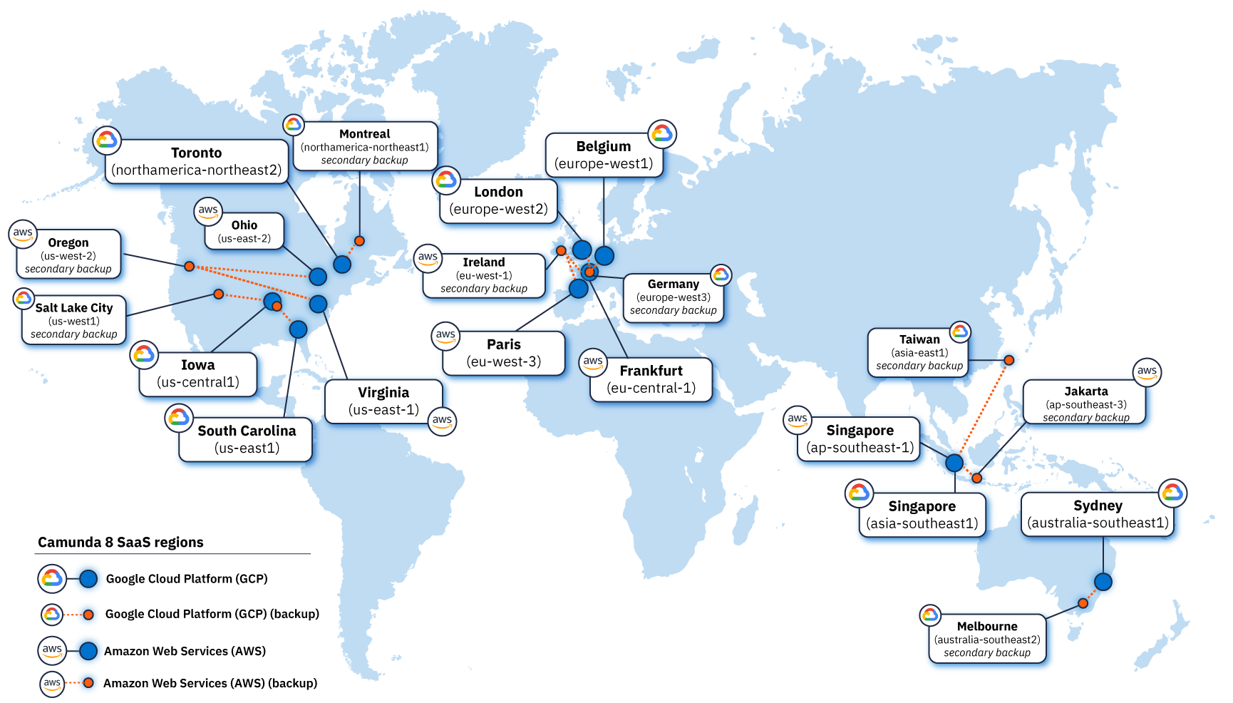 The following GCP regions are currently supported in Camunda 8 SaaS.