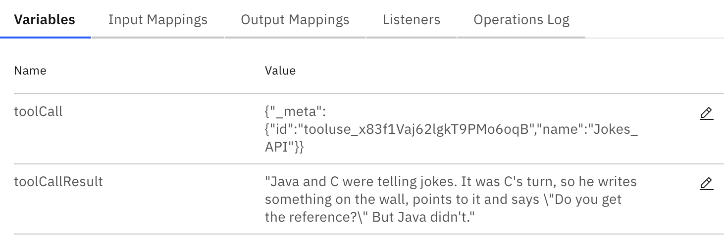 - In the execution tree, select the AI_Agent#innerInstance parent element of the Jokes API tool. You will see:
